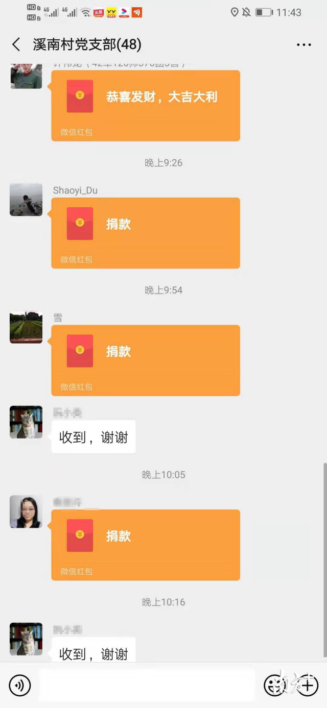 村要实现封闭式管理,就要在村口设置检查点,经过分析研究 ,至少设置两个点,但是村防控物资极度和人员缺乏,为此 ,经村两委研究,决定进行募捐物资和招募志愿者,通过微信群向全体村民和党员发起号召,筹集防控物资和招募疫情防控志愿者 ,倡议一出,党员纷纷带头捐款,其他村民和热心群众也积极响应 ,捐款捐物,为疫情出钱出力。党员积极作用尤其突出,短短2个小时内就有16名党员捐款。至今共筹集防控资金38600元 ,口罩380个,电子体温计2个,招募疫情防控志愿者13名(党员志愿者5名) ,解决了物资短缺和人员不足的问题,为村防控疫情提供了坚实的物资和人员保障 。