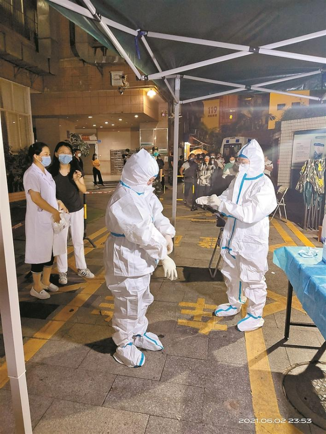6月2日深夜 ,各医院闻令而动:作为医院疫情防控总指挥,深圳市中医肛肠医院(福田)院长李一兵收到“战令 ”后,马上调度指挥,“我们不知道具体检测任务指标有多少 ,只知道‘疫情就是命令,防控就是责任’,不到3分钟 ,人员就定下来了。”副院长梁靖华迅速从家中赶来,副院长郭文涛在医院协调物资准备,共派出9名医务工作者支援现场。