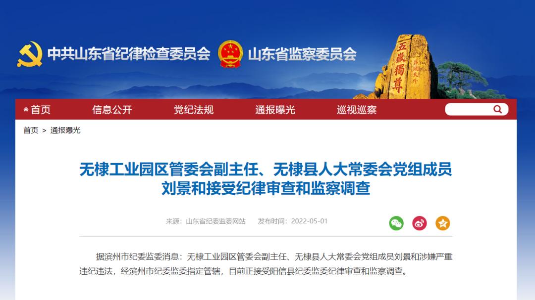 无棣工业园区管委会副主任、无棣县人大常委会党组成员刘景和涉嫌严重违纪违法,经滨州市纪委监委指定管辖,目前正接受阳信县纪委监委纪律审查和监察调查 。(山东省纪委监委网站)