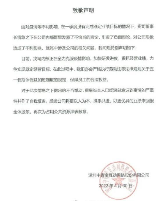 日前 ,中青宝就近期公司高管内部群发表不当言论发布致歉声明。全文如下: