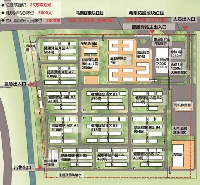 国际健康驿站项目位于白云区钟落潭镇105国道广从公路段以南,马沥地铁站旁 ,用地面积约25.78万平方米(400亩) 。项目总建筑面积约为25万平方米,拟建设5000张床位的健康驿站,同时可为后勤服务人员提供2000张床位。