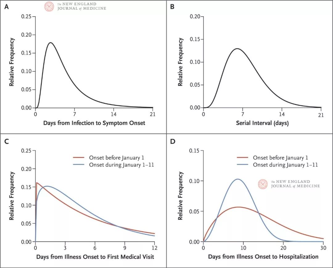 潜伏期(即从感染至发病的时间)的估计分布情况见图A 。 由一人传至另一人的间隔时间(即传播链中连续病例的发病时间间隔期)的估计分布情况见图B。 从发病至首次就诊的间隔时间的估计分布情况见图C。 从发病至住院的间隔时间的估计分布情况见图D 。