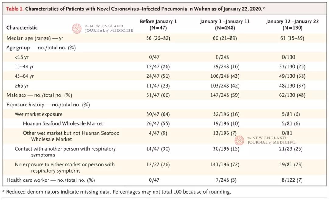 表1.截至2020年1月22日时武汉新型冠状病毒感染肺炎患者的特征。*