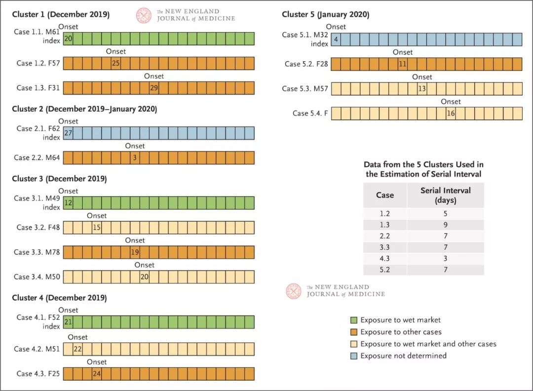 方框内的数字是2019年12月和2020年1月的日期 。我们采用5个继发病例(明确只暴露于1个指示病例 ,并且无其他潜在传染源的患者)的数据估算了由一人传至另一人的间隔时间的分布情况。前4个病例集群是在武汉发现,第5个病例集群是在黄冈发现。