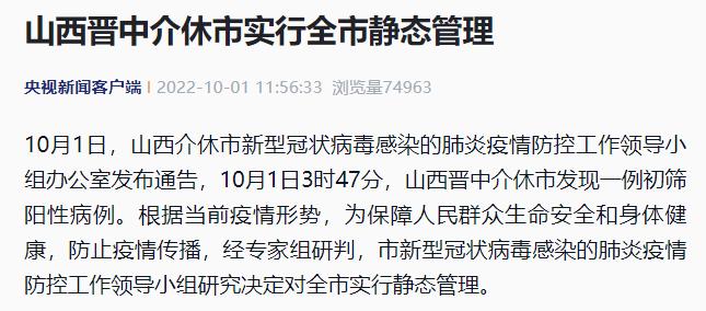 10月1日 ,山西介休市新型冠状病毒感染的肺炎疫情防控工作领导小组办公室发布通告,10月1日3时47分,山西晋中介休市发现一例初筛阳性病例 。根据当前疫情形势 ,为保障人民群众生命安全和身体健康,防止疫情传播,经专家组研判 ,介休市新型冠状病毒感染的肺炎疫情防控工作领导小组研究决定对全市实行静态管理。