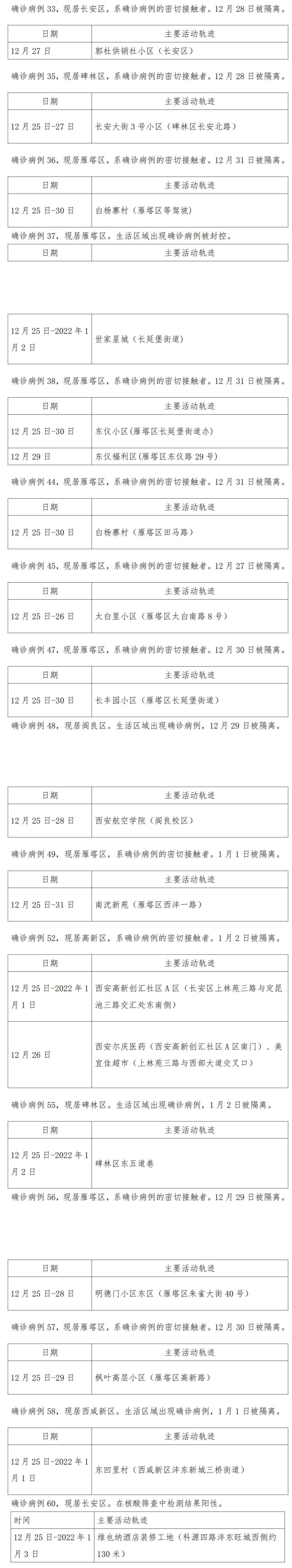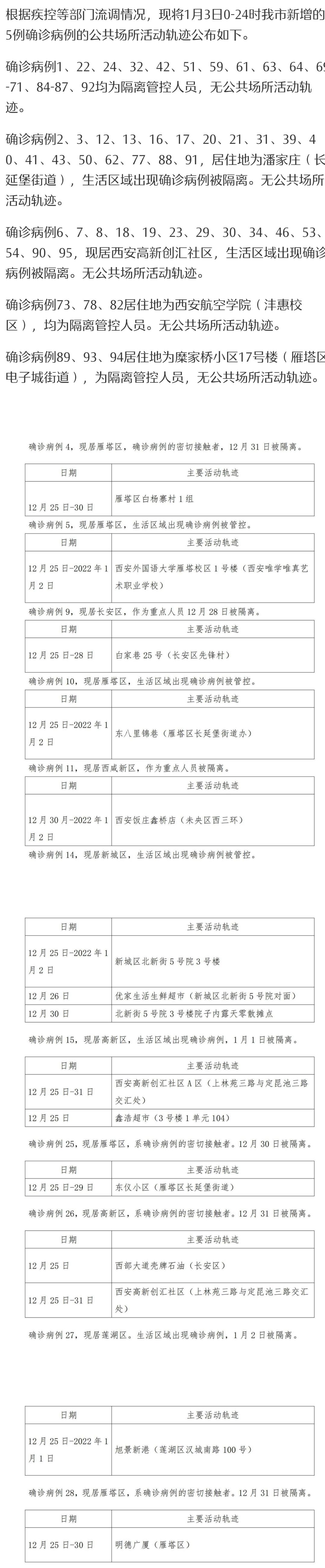 ▲根据疾控等部门流调情况,现将1月3日0时-24时西安市新增确诊病例的公共场所活动轨迹公布如下。未公布活动轨迹的新增确诊病例,属于流调研判后 ,在可能传染期内无公共场所活动轨迹,或近期该病例已纳入管控隔离,与普通市民无轨迹交叉可能 。