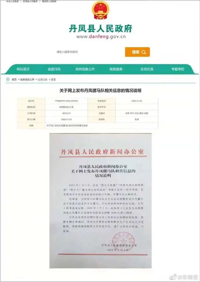 1月3日上午,陕西省网络举报中心举报电话、官方微博等收到群众举报,询问网传“商洛群众用骡子拉物资 ,为疫区(西安)运输物资”视频是否属实。接到举报后,陕西省网络举报中心立即联系商洛市有关部门,要求迅速核实情况 ,如确属不实信息立即进行辟谣。后经核实该视频为丹凤县赵某等3人自发为龙驹寨街道办凤麓社区疫情防控检查站捐赠5600元爱心物资,原发视频为抖音账号“燃点正能量 ”发布,后经网民添加“加油!西安!”“限行后马匹运送抗疫物资”等文字重新发布,造成了不实信息并广泛传播 。当日12时许 ,丹凤县人民政府发布了《关于网上发布丹凤骡马队相关信息的情况说明》,14:40人民日报客户端发布《陕西丹凤回应限行后马匹运送抗议物资:不属实》。