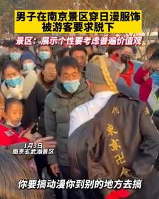 ▲1月3日,网传江苏南京玄武湖景区内,一男子穿着日本动漫服饰 ,衣服上印有“东京卍会”等字样,被游人要求脱掉 。该视频引起了不少网友的愤慨,认为在南京穿着日本服饰游走在公共场合不够尊重历史。还有网友科普视频中的衣服为日本动漫《东京复仇者》中服饰。4日 ,玄武湖景区工作人员告诉记者,他们也已关注到相关情况,呼吁年轻人在展示个性的同时,要考虑社会民众的普遍价值观念 。