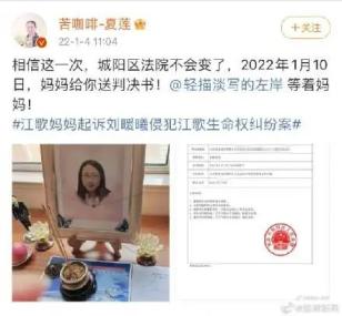 ▲1月4日 ,江歌母亲江秋莲起诉刘暖曦(原名:刘鑫)生命权纠纷一案将于1月10日上午在青岛市城阳区人民法院开庭宣判。此前,2021年12月27日,青岛市城阳区人民法院曾发开庭传票传唤江秋莲 ,称该案定于12月31日上午开庭宣判。在原定的宣判日期前一天,12月30日晚,江秋莲和代理律师黄乐平接到城阳区人民法院工作人员通知称 ,因审判长身体不适,该案原定的开庭宣判暂时取消。