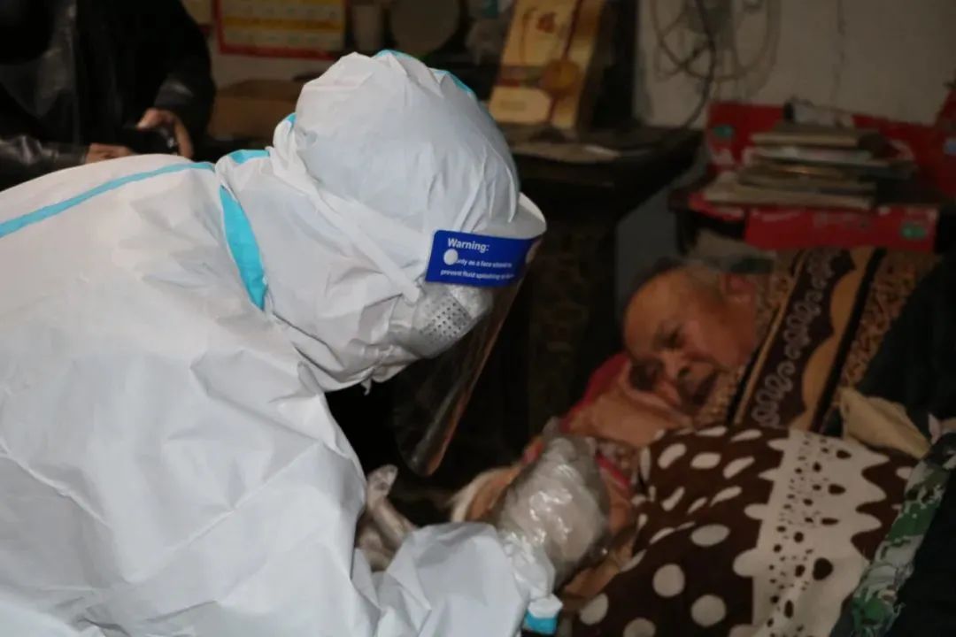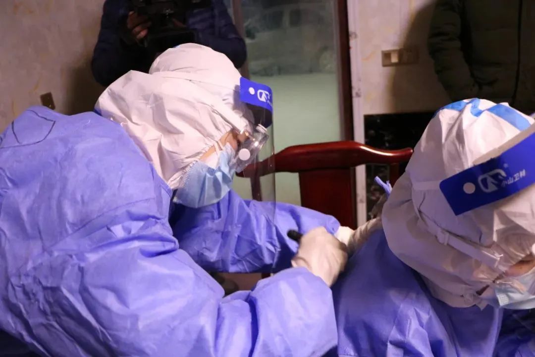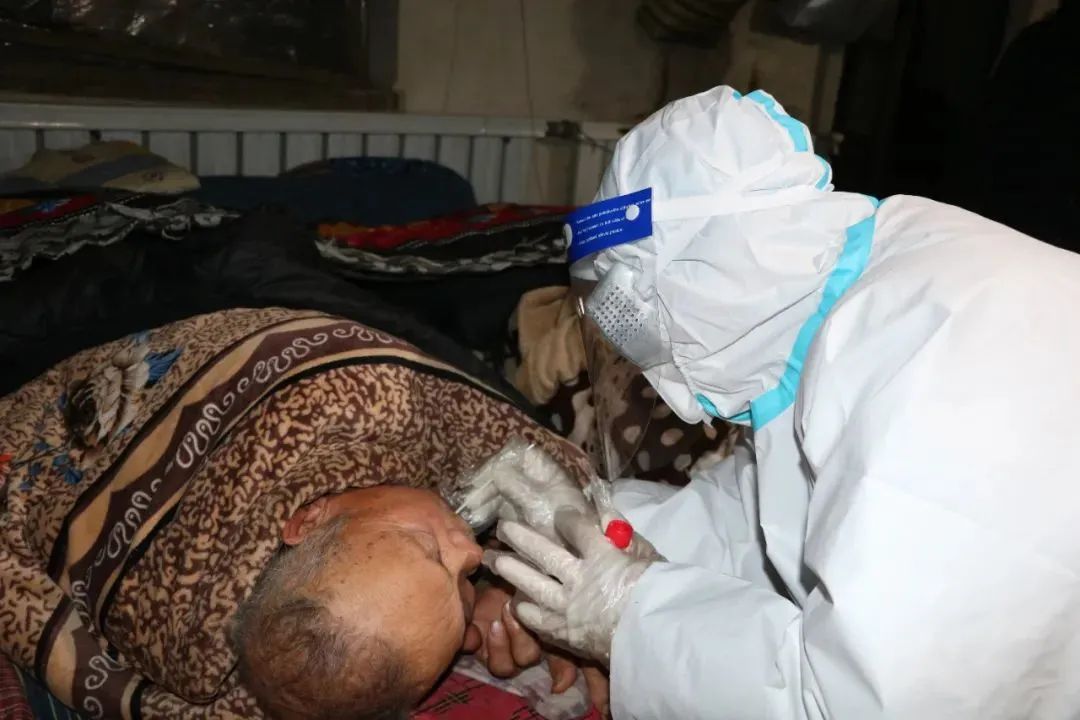 在四芝兰镇大杨庄村,1月6日晚11时,宁晋县医院医护人员到卧病在床行动不便的老人家中 ,上门为他们进行核酸检测采样。