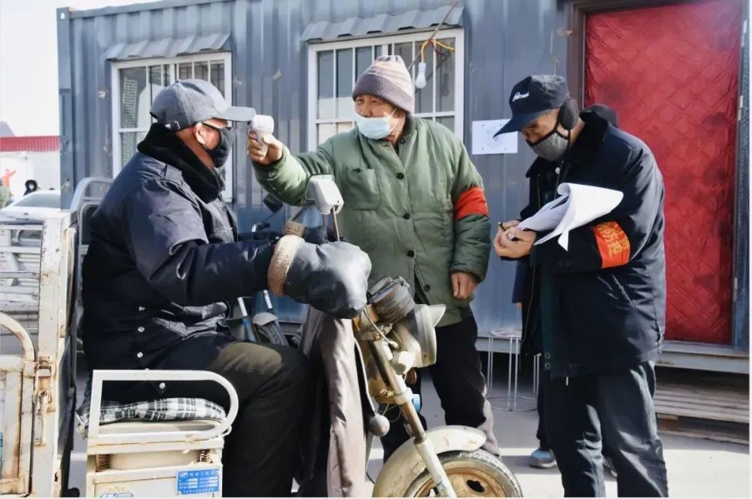 在贾家口镇小刘村,村干部和志愿者落实疫情防控工作部署,坚守在卡点执勤 ,对来往车辆和行人进行登记检测。
