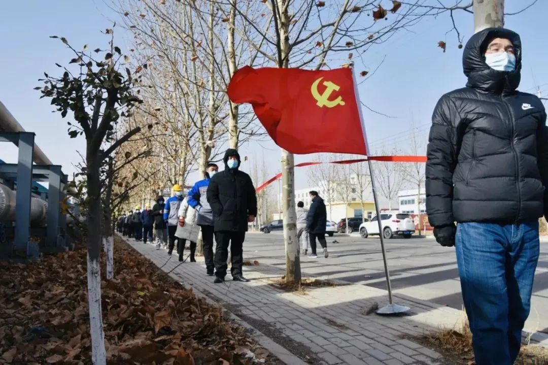1月6日,盐化工园区企业的工人以树为间隔一字排开 ,有序排队接受核酸检测。