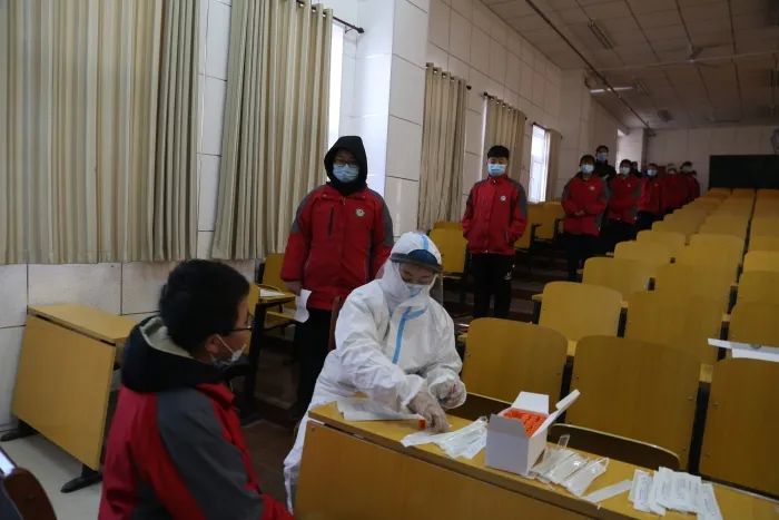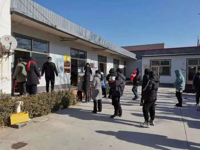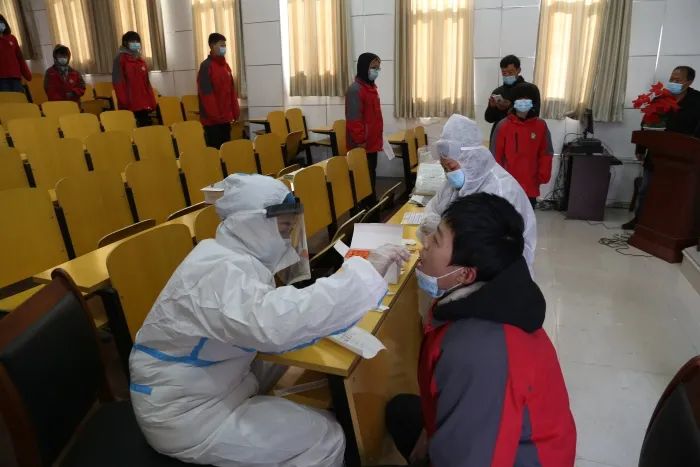 1月6日,苏家庄镇中学的学生们在老师的指引下,有序排队进行核酸检测采样 。