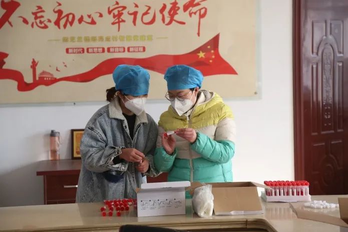 在贾家口镇黄儿营西村,医护人员在为居民做核酸检测,他们两人在1月6日一天内完成了3000多名群众的样本采集。