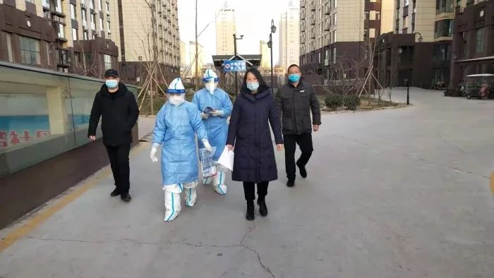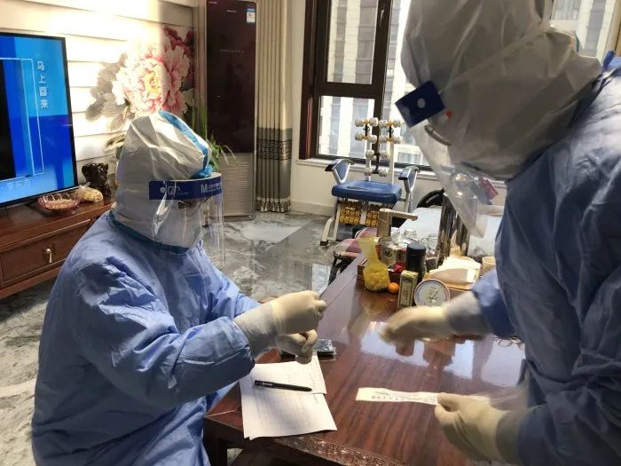 文源社区配合医护人员到奥体广场小区上门为出行不便的住户做核酸检测 。